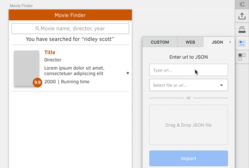 Now, continue with the remaining text layers. Select “2000” on the artboard, and assign the value from release_year, as well as “Running time” on the canvas and runtime from Craft. For the rating in the orange circle, use (you guessed it!) the rating field. Instead of using a URL for the JSON file, you can employ your own data: Delete the current source with the “x” icon next to the input field, and drag your JSON data to the appropriate field below (or simply click there and select it from the computer).