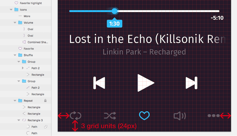 Show the grid again (with Ctrl + G), and use it to align the “repeat” icon 3 grid units away from both the left and bottom edges. Lock it with Shift + Cmd + L. Proceed to the “more” icon and also give it a spacing of 3 units from the right artboard edge. The vertical alignment doesn’t matter at the moment. Now, select all icons (or their groups) in the layers list, including the locked one; select “Align Middle” from a right-click to align them all to the locked element, and click on “Distribute Horizontally” from the same menu to space them equally from each other. Be sure to keep the icons selected for the next step.