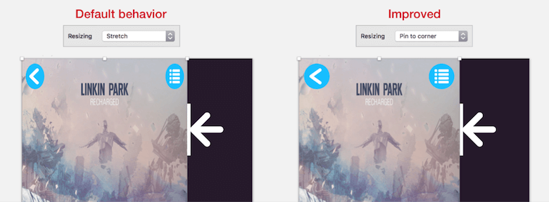 If we change this setting for some objects, we will start to see some initial results. Select the “Back button” group, for example, and set it to “Pin to corner”; this will stop the elements from being resized but will maintain the same distance from the closest edge of the parent group. Do the same for the “List button” group, and try to resize the “Container” group now. These two elements will show improved behavior.