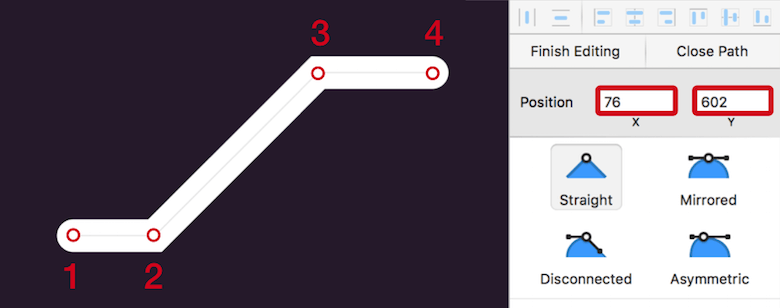Now, click to add a point, then hold Shift (to constrain the movement to the horizontal axis), go slightly to the right, and make another click. Pressing Escape will stop the drawing process and let you focus the first point again with a click. As with the repeat icon, copy its X position in the Inspector, press Escape again, select the second point, focus its X field, and insert the value there, but add “+5”. Pressing Enter will move the point 5 pixels to the right of the other point.