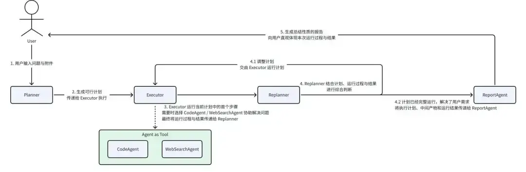 - 順序運行:Plan-Executor 整體運行完後,固定運行一次 ReportAgent 進行總結。
