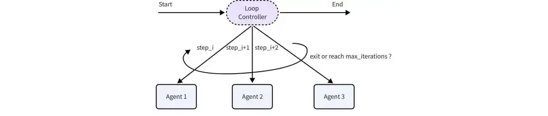 - LoopAgent:重複執行配置的子 Agent 序列,直到達到最大迭代次數或某個子 Agent 產生 ExitAction,每次迭代的結果都會累積,後續迭代的輸入可以訪問所有歷史信息。LoopAgent 基於 SequentialAgent 實現。