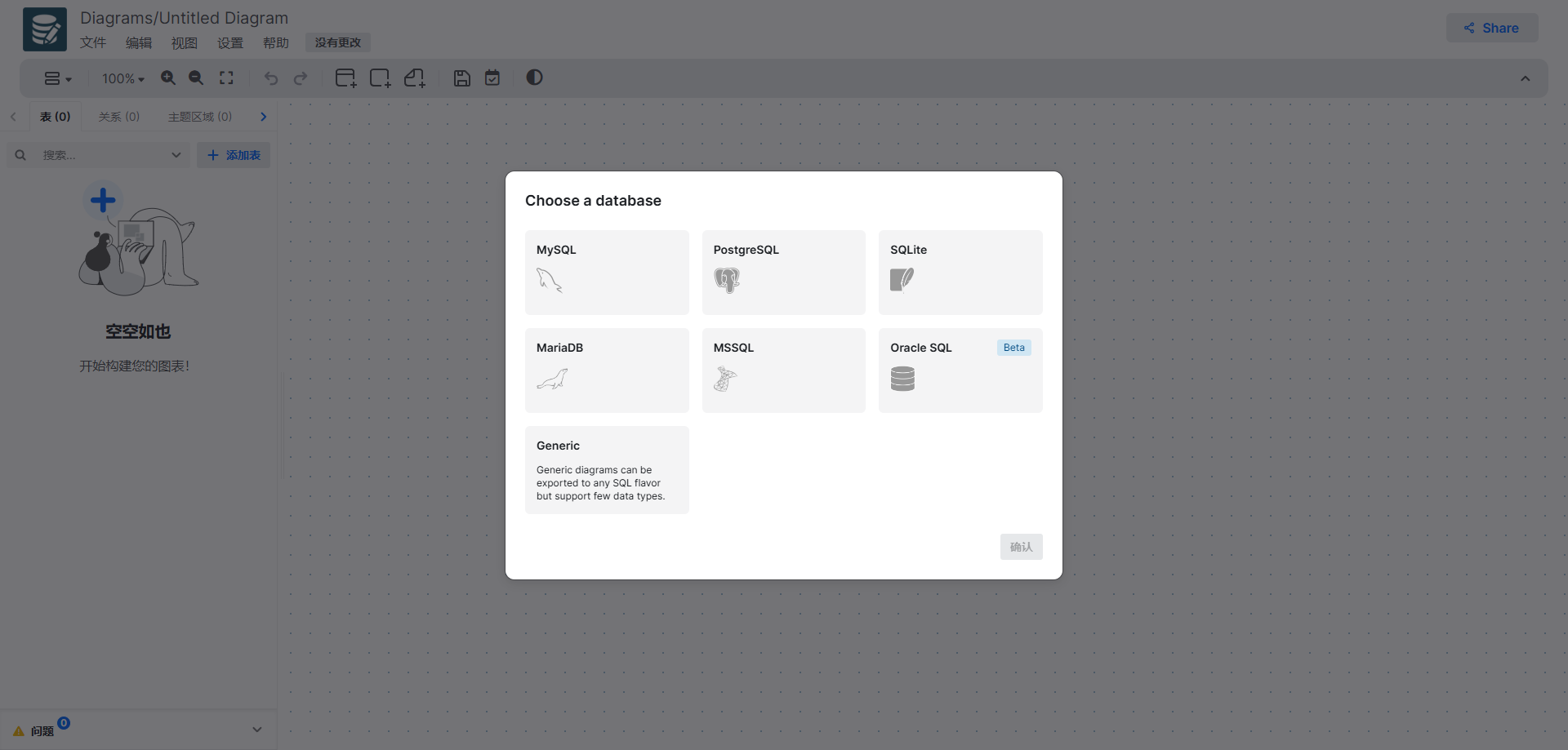 1、在開始使用 drawDB 時,需要先選擇數據庫類型,目前支持多種數據庫