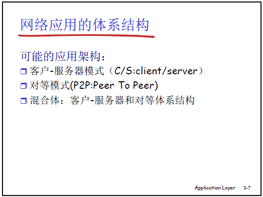 - 應用的交互模式:客户 - 服務器(CS)模式、對等(P2P)模式。