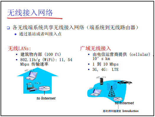 - 寬帶接入:從撥號 modem(56Kbps)→ DSL(專用線路,下行≤24Mbps)→ 光纖到户(高帶寬、低延遲)。