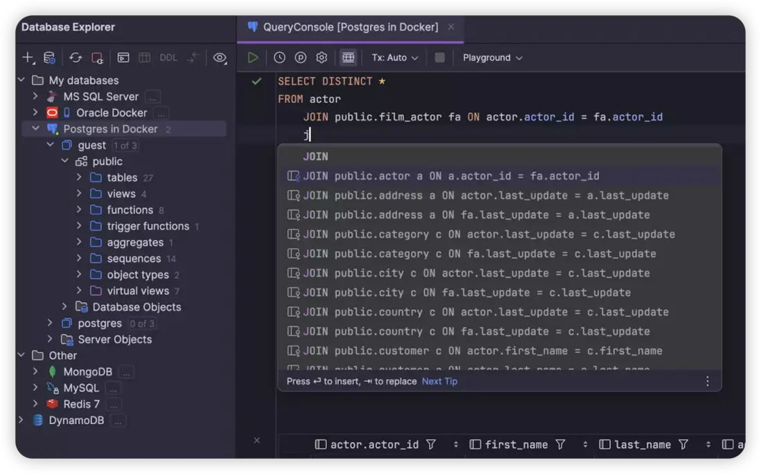 • 智能編碼輔助:DataGrip 繼承了 JetBrains IDE 強大的智能代碼補全、語法高亮、實時錯誤檢測和代碼重構功能,能極大地提升編寫 SQL 腳本、存儲過程等的效率和準確性。