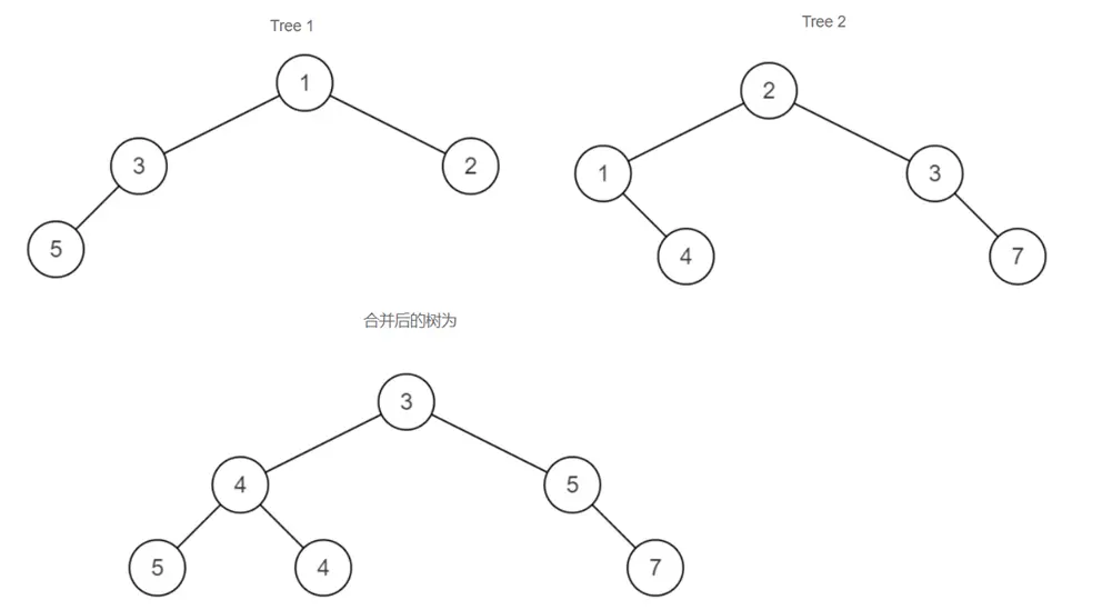 已知兩顆二叉樹,將它們合併成一顆二叉樹。合併規則是:都存在的結點,就將結點值加起來,否則空的位置就由另一個樹的結點來代替。例如: