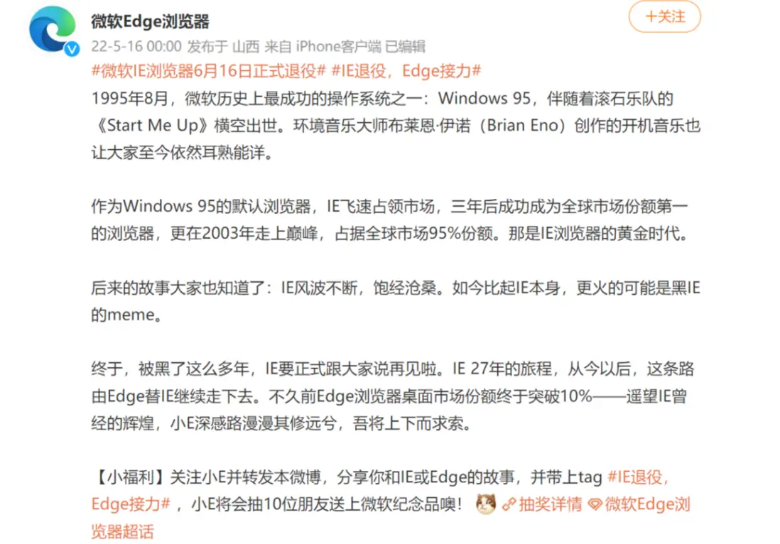 5 月 16 日,@微軟 Edge 瀏覽器官方微博賬號發文宣佈“微軟 IE 瀏覽器將於 6 月 16 日正式退役”,此消息一出引發網友熱議。