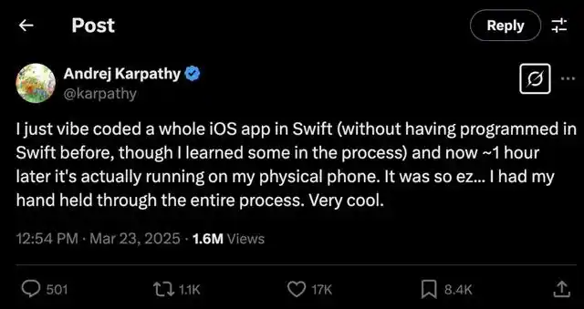 最近,Karpathy 又在社交媒體上分享了他的最新嘗試:“剛用‘氛圍編程’搞定了一個完整的 iOS 應用!雖然之前完全沒碰過 Swift,但也就 1 個多小時吧,這個 app 就已經能在手機上跑起來了。整個過程非常絲滑,基本上都是 AI 手把手帶着我完成的。”