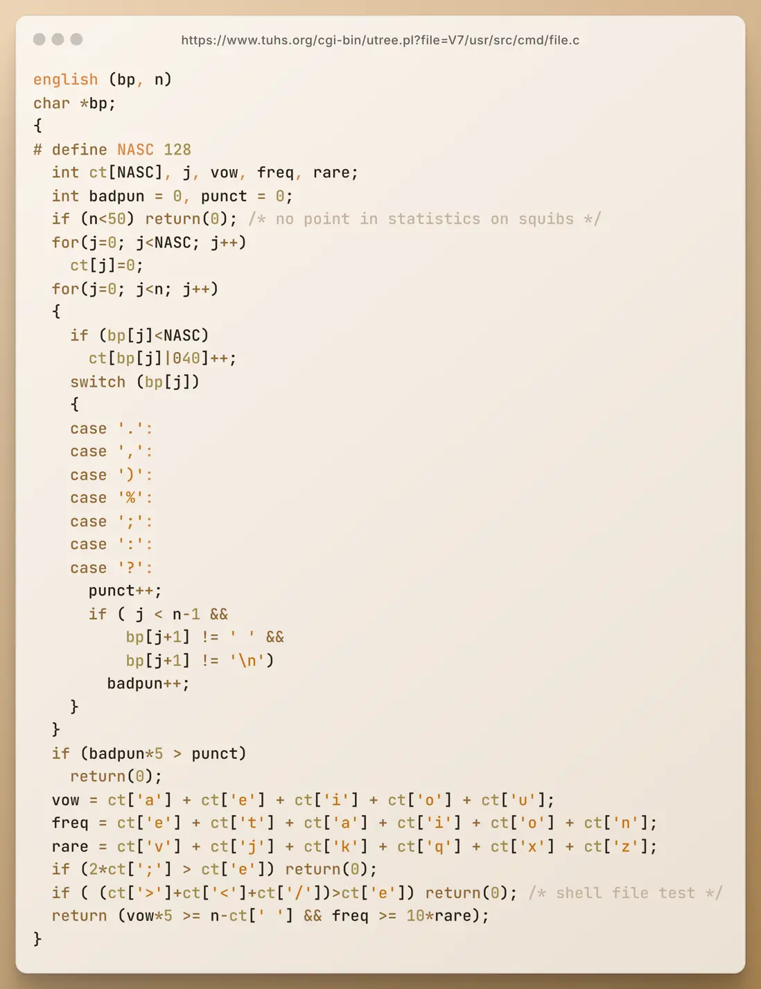 相比之下,1979 年的這段 english() 函數雖然原始,卻展現了早期計算的美學:在資源有限的條件下,用最簡單的方法儘可能準確地解決實際的問題。