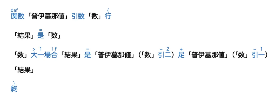 代碼中還有些漢字沒有括在「」之中,除了表示數字的零一二三四五六七八九,剩下的那些漢字相當於運算符和關鍵字。如 関數 相當於 Python 中的 def,表示開始定義函數。 是 相當於賦值的 =; 大 相當於比較運算符 >; 引 和 足 來自日語的引く和足す,分別表示減法和加法; 場合 一詞多出現在日語中表示”如果……就……“的句子中,正好對應 if 語句。