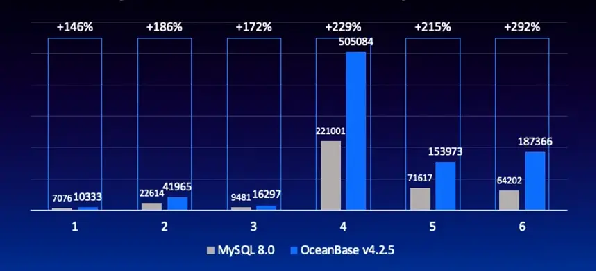 作為連續12年保障“天貓雙11”大促活動以及用於支付寶核心系統的數據庫,OceanBase久經高併發場景的多重性能考驗。2025年3月,OceanBase性能再次升級,在同等的硬件規模下(16 核配置),經過 Sysbench 標準測試集的實際測試(見圖1),其單機版在整體性能(包括查詢、批量讀取、寫入、讀寫混合、插入和更新操作)方面全面優於 MySQL 8.0。特別是在高併發寫入場景中,吞吐量實現了顯著提升,最高提升達到 214.99%,能夠滿足高負載場景下的業務需求。
