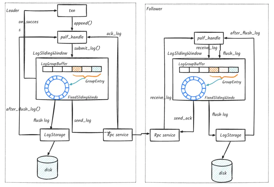 OceanBase 4.x版本在3.x版本日誌聚合方案基礎上,重新做了設計,降低了單條日誌數據buffer拷貝的次數,以日誌流的維度,進一步提升了日誌聚合能力,架構如圖7所示。