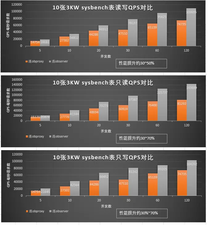對於單機部署的模式,選擇通過連接OBProxy訪問OBServer還是直接連接OBServer,會影響其在10張3000萬條記錄的sysbench表讀寫QPS的表現。測試結果顯示,直接連接OBServer的性能比通過OBProxy連接的性能高30%~50%。因此,對於單機部署的模式,我們建議直接連接OBServer,以避免通過OBProxy訪問OBServer時產生的額外網絡開銷。