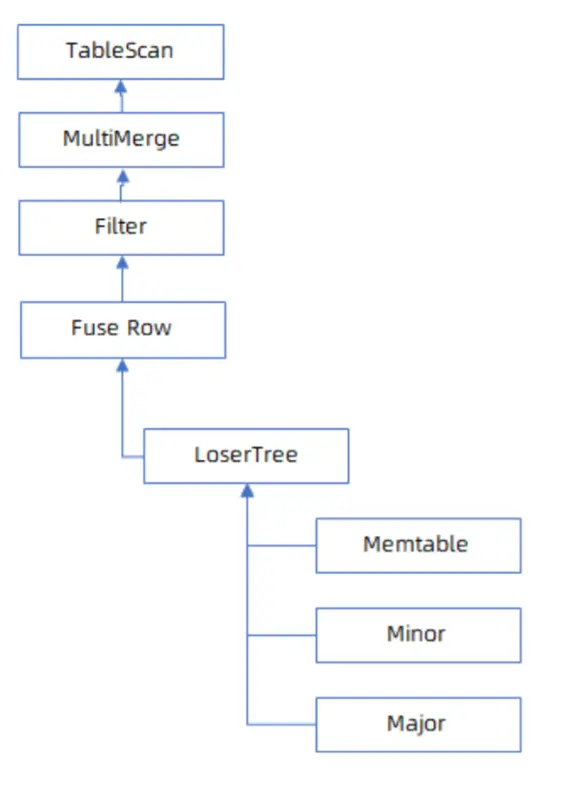 在當前版本中,OceanBase 對這種處理方式做了比較多的優化,例如在查詢過程中能動態判斷某層 SSTABLE 的宏塊/微塊內的數據與其它 SSTABLE 內的數據是否有交叉。如果某個宏塊、微塊內的主鍵和其它的微塊沒有交叉,説明這批主鍵只在這個宏塊、微塊內存在,可以不需要走敗者樹,只對這個 SSTABLE 進行掃描。