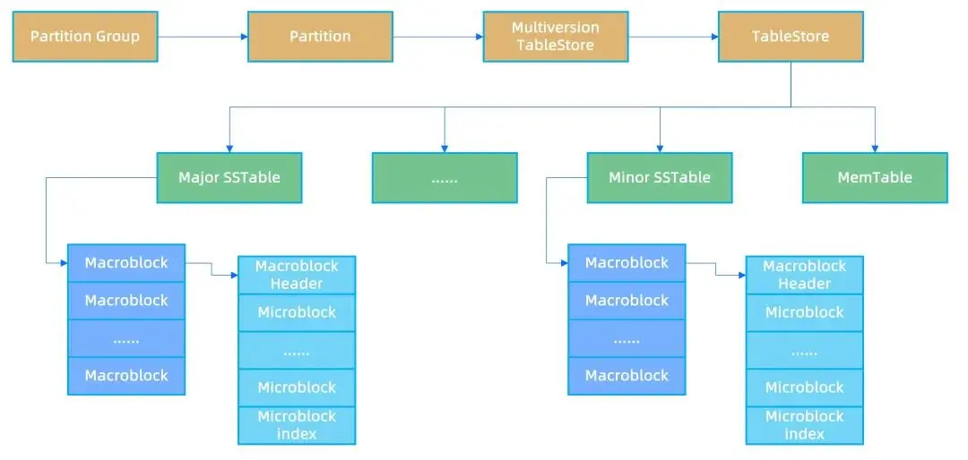 • OceanBase 採用的是 LSM Tree 的存儲架構,每張表的每個分區中,數據在磁盤上存儲的邏輯單位是 SSTABLE,LSM Tree 的每層數據包含一個或者多個 SSTABLE,每個 SSTABLE 內部數據按主鍵順序排列。
