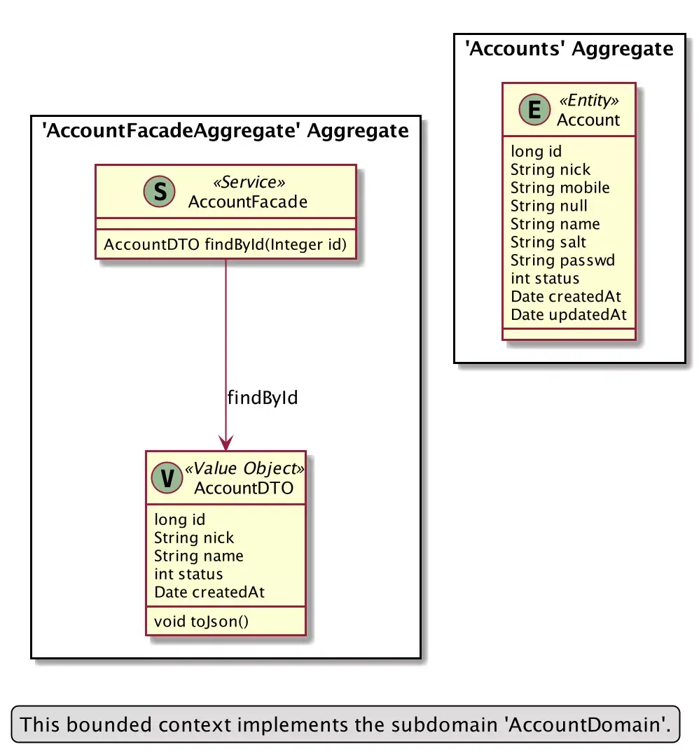 - AccountFacadeAggregate: 表示提供給外部調用的聚合,這裏DTO的對象定義、服務接口的定義等。