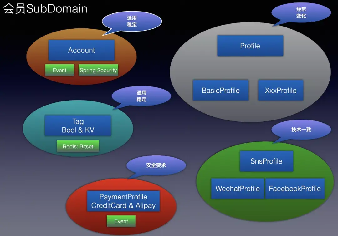 如花首先將會員先劃分為幾個Sub Domain,如處理賬號相關的Account,處理會員打標的UserTag,處理支付方式的PaymentProfile,處理社交平台集成的SnsProfile,還有一個其他Profiles,這裏我們不涉及Generic和Supporting Doman的規劃,主要從業務核心Domain出發。一個同學用PPT闡述了劃分結構和出發點,如下: