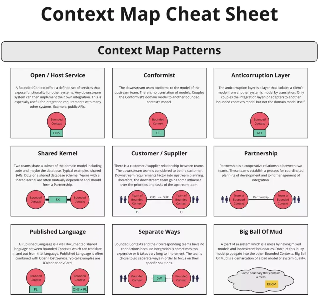 - 戰略設計(Strategic DDD):Bounded Context, Context Map; Published Language, Shared Kernel, Open Host Service, Customer-Supplier, Conformist, Anti Corruption Layer (context relationship types)。
