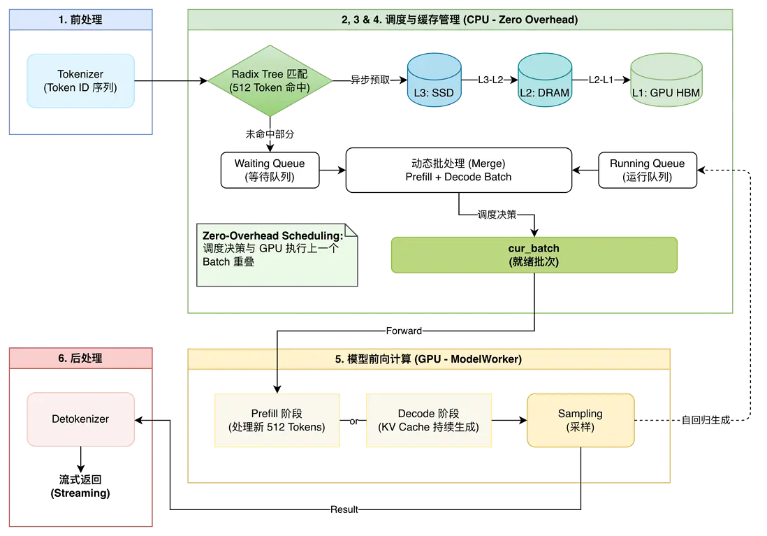 在 SGLang 等高性能 LLM 推理引擎中,單個請求從接收到完成並非串行執行,而是被嵌入一條深度流水化、異步協同的處理流水線中。該流水線通過 CPU-GPU 協同、多級緩存預取與動態批處理等機制,在保障低延遲的同時最大化吞吐效率。