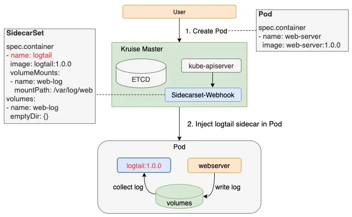 OpenKruise SidecarSet 基於 Kubernetes AdmissionWebhook 機制實現了 sidecar 容器的自動注入,因此只要將 sidecar 配置到 SidecarSet 中,不管用户用 CloneSet、Deployment、StatefulSet 等任何方式部署,擴出來的 Pod 中都會注入定義好的 sidecar 容器。