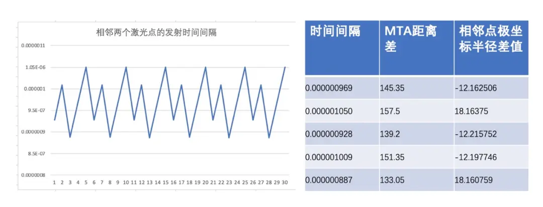 為了識別MTA問題,激光廠商設計了一系列專利技術,其核心是“激光發射間隔可變”,即相鄰激光脈衝發射的時間間隔是不同的,如圖4。而且這個發射間隔的變化具備週期性,其週期特點如圖5所示。當將點雲放錯MTA區間時,其測距不再是連續的,而是如圖5中列表第3列所示,來回跳躍。如圖6,錯誤的MTA區間,相鄰點來回跳躍,形成圖中的分層。