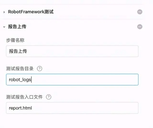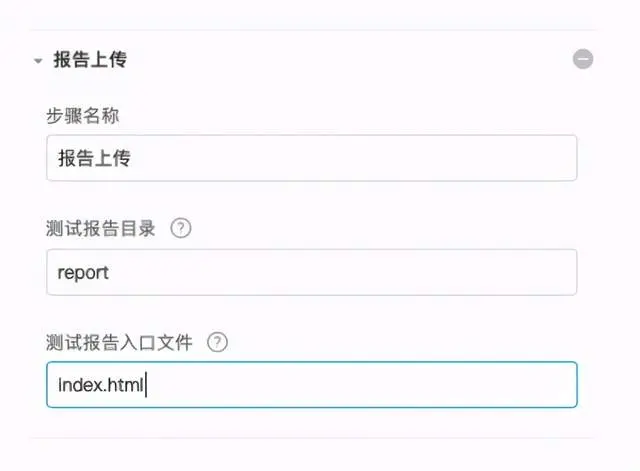 在測試節點添加報告上傳步驟,測試報告目錄填“report”,測試報告入口文件為“index.html”。