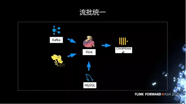 所以我們在建設 Flink 之後,做了非常多的工作。把原先 Flume 到 Hive 的流程替換掉,今天所有的 ETL 都是通過 Kafka,再經過 Flink,所有的打點都會進入到 Hive 離線數倉,作為歷史的保存,使數據不丟失。同時,因為很多作業需要實時的分析,我們在另外一個鏈路,從 Flink 直接進入 ClickHouse 實時數倉來分析。