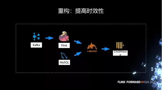 因此我們在第一步的改造過程中取了一個折中,沒有直接利用 Flink 在一個作業裏面把所有的維度 join 起來,而是把它拆分成了幾個作業。每個作業計算一部分維度,然後把這些結果先利用 HBase 做了一個 join,再把 join 的結果導入到 ClickHouse 裏面。