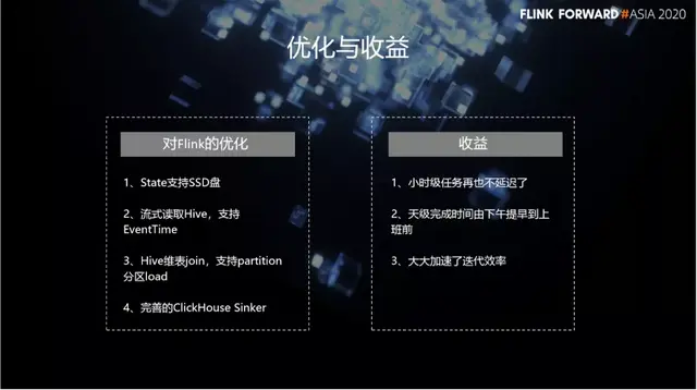 經過第二輪迭代之後,我們今天在 Flink 上已經能夠扛住大表的天級別的窗口交易。這個流批統一的方案已經上線了,我們直接通過 Flink 去計算完整個大寬表,在每天的窗口觸發之後,將結果直接寫到 ClickHouse 裏面,基本上凌晨就可以產出結果。