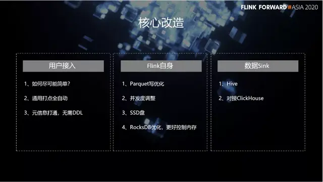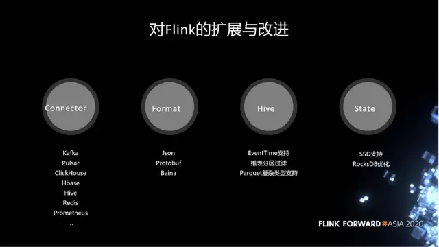 最後,在數據 Sink 這一塊,我們做了非常多的定製化的開發,不僅支持 Hive,也對接了 ClickHouse。