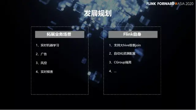 - 另外一塊就是在 Flink 自身上面,我們內部有很多場景要做。比如説,支持大 Hive 維表 join,自動化資源配置,CGroup 隔離,等等。以上就是我們在未來要做的一些工作。