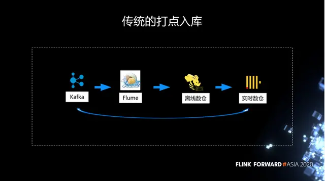 傳統的打點入庫,都是通過 Kafka 到 Flume,然後進入到 Hive,最後到 ClickHouse。當然 ClickHouse 裏面大部分是從 Hive 導進去的,還有一部分是通過 Kafka 直接寫進去的。