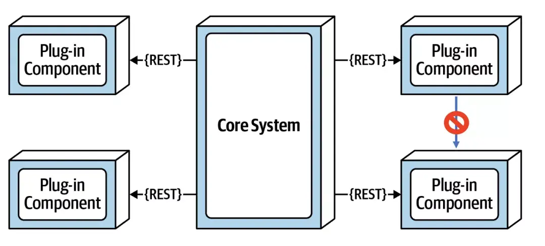 Plug-in組件,也就是微服務架構中的服務,是不能直接通訊的,而是需要Core System進行轉發。這樣做的好處和微內核架構一樣,插件相互之間無直接聯繫,彼此之間非常透明,例如服務A下線後,完全不需要通知其他服務;服務A被替換,也不需要通知其他服務;服務A從數據中心1到數據中心2,也不用通知其他服務;即便服務N和服務A之間網絡不互通,兩者之間也能通訊。
