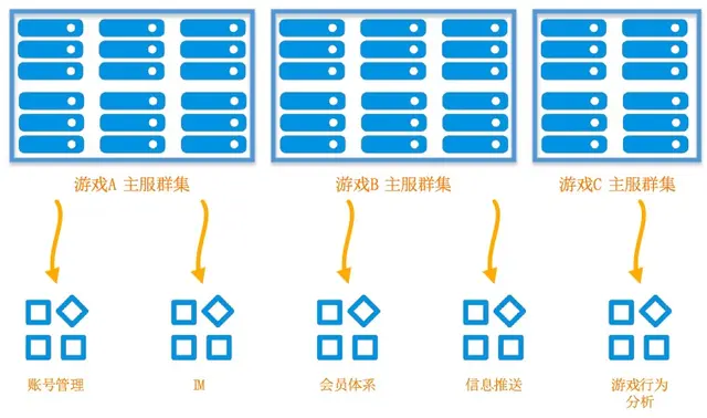 在技術架構的多次迭代升級中,有一項非常重要的工作,就是將遊戲場景中通用的業務能力進行抽象,從遊戲主服中進行剝離,沉澱到統一服務層,以模塊化的方式同時支撐江娛互動的多個遊戲品類。從主服中剝離出來的業務能力包括賬號管理、IM、內容安全、會員體系、信息推送、遊戲行為分析等多個方面,這樣做首先降低了遊戲主服的業務複雜度,使主服專注於對核心遊戲場景的支撐。此外,通用的能力可以在多個遊戲品類中得到複用,從而降低研發成本,提升研發效率。