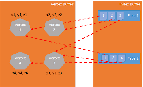For instance, the following index buffer is a list of two faces: [1 2 3 1 3 4]. The first face contains vertex 1, vertex 2 and vertex 3. The second face contains vertex 1, vertex 3 and vertex 4. So, there are four vertices in this geometry: