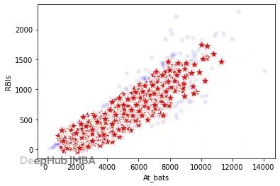 真實數據(藍點)和GMM生成的合成數據(紅星)的At_bats與RBIs