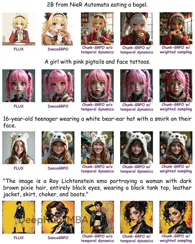 這個缺陷會讓模型學錯東西,即便最終生成的圖像看起來還不錯。論文"SAMPLE BY STEP, OPTIMIZE BY CHUNK: CHUNK-LEVEL GRPO FOR TEXT-TO-IMAGE GENERATION"提出了一個叫Chunk-GRPO的解決方案,思路直接並且效果出眾,算是訓練生成模型思路上的一次轉向。
