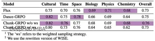 WISE的結果,顯示WISE基準測試結果。再次強調Chunk-GRPO(w/o ws)獲得了最高的"總體"分數。