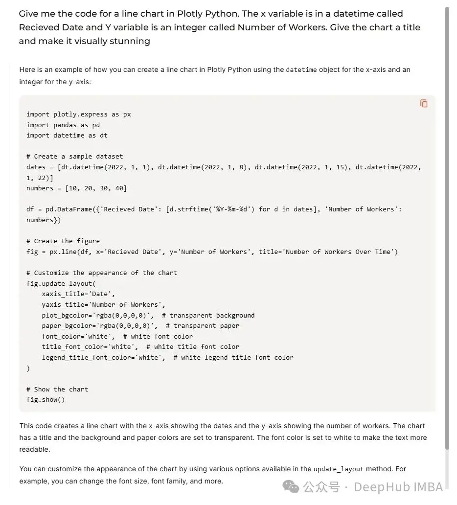 通過運行以代碼創建的圖表,將註釋、標籤/標題和軸格式與樣式信息完全一致。因為已經有了數據信息,所以我們直接提出要求就可以,不需要輸入任何的數據信息