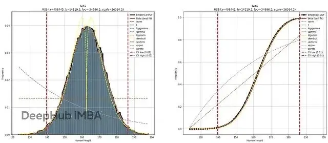 檢測異常前先要對"正常身高"擬合一個分佈(PDF)。distfit庫可以擬合多達89個理論分佈,這裏只搜索常見的概率密度函數,因為身高數據大概率是鐘形曲線。安裝依賴