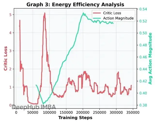 學習階段(50k-200k步),Critic損失達到峯值,智能體還在跟物理規律較勁。極限環建立後(200k步以後),動作幅度穩定下來,Critic損失也降到較低水平。