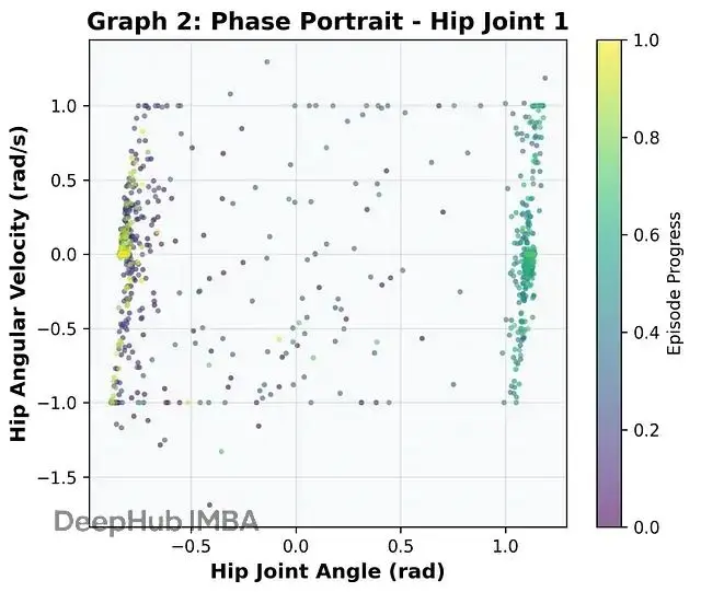 隨着訓練推進(顏色向黃綠過渡),散點開始收斂成一個封閉的軌道形狀。這在控制論和生物力學裏叫極限環(Limit Cycle)。