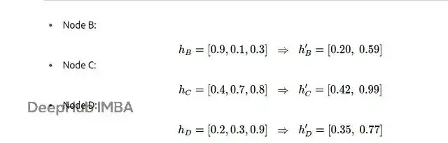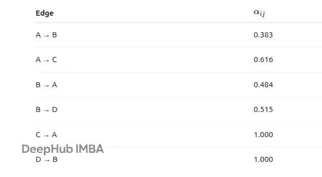 從這些結果可以看出:節點A更偏向於關注節點C而不是B;節點B在A和D之間的注意力分配比較均勻;節點C和D各自只有一個鄰居,所以所有注意力都分配給了那個鄰居。