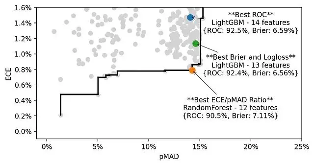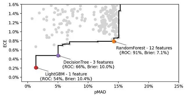 這裏就發現了一個有個有意思的規律:特徵數量越多,pMAD越高。這符合我們的理解,更多特徵意味着更多區分樣本的依據。但問題是pMAD增加往往伴隨着ECE的上升,也就是校準變差。