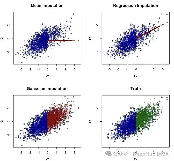 (通用的)插補的目標應該是儘可能地複製底層數據分佈。為了説明這一點,考慮第一個例子,其中p=0,這樣只有X_1缺失值現在將嘗試使用著名的MICE方法來插補這個例子。由於只有X_1缺失,可以手動實現這一點。我們從均值插補開始,簡單地計算在觀測到的模式中X_1的均值,並將這個均值填補到NA的位置。我們還使用了更為複雜的迴歸插補:在觀測到X_1的模式中,將X_1對X_2進行迴歸分析,然後對每個缺失的X_1觀測值,我們插入迴歸的預測值。最後,對於高斯插補,我們從X_1對X_2的同樣迴歸開始,但隨後通過從高斯分佈中抽取來插補每個缺失的X_1值。也就是説我們不是僅插補條件期望(即條件分佈的中心),而是從這個分佈中抽取。這導致了一種隨機插補,起初可能有些違反直覺,但實際上會帶來最好的結果: