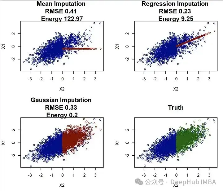 在使用均方根誤差(RMSE)評估時,迴歸插補看起來表現非常好!它超過了均值插補和高斯插補。但是這與我們上面的分析相沖突,選擇迴歸插補可能會導致高度偏見的結果。而(標度化的)能量距離正確地識別出高斯插補是最佳方法,這與視覺和更好的參數估計相一致。