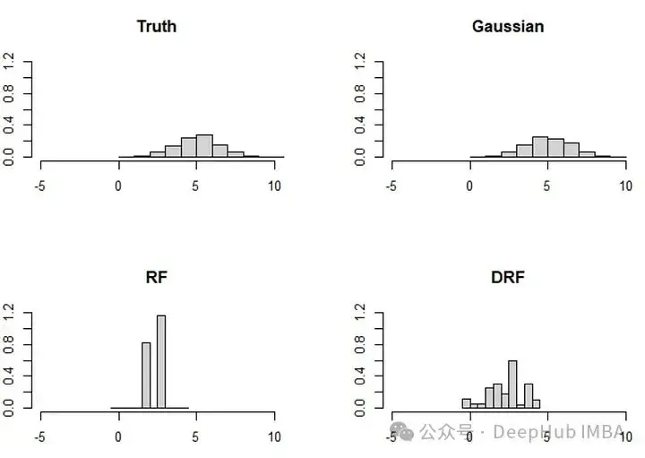 雖然mice-cart和mice-DRF都做得不錯,但它們仍然不如高斯插補那麼好。這本身並不令人驚訝,因為在這種情況下,高斯插補是理想的插補方法(因為 (X_1, X_2) 確實是高斯分佈的)。而X_2中的分佈變化可能可能導致mice-cart和mice-DRF在恢復3000個觀測值的分佈時遇到困難(這些方法通常非常有效)。