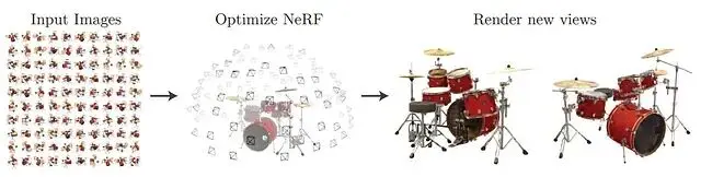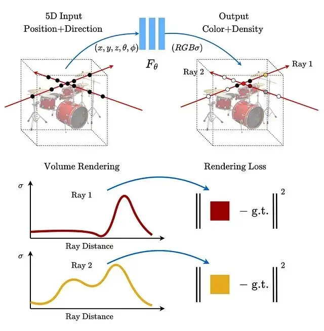 NeRF(Neural Radiance Fields,神經輻射場)的核心思路是用一個全連接網絡表示三維場景。輸入是5D向量空間座標(x, y, z)加上視角方向(θ, φ),輸出則是該點的顏色和體積密度。訓練的數據則是同一物體從不同角度拍攝的若干張照片。