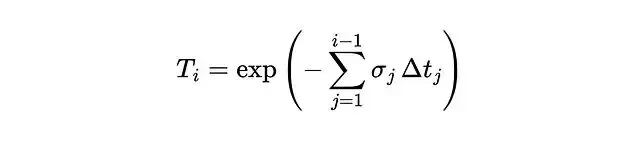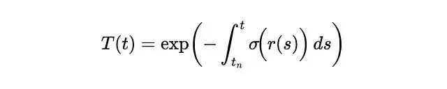 密度σ描述的是某點對光線的阻擋程度,可以理解為吸收概率。更嚴格地説它是光線在該點終止的微分概率。根據這個定義,光線從t傳播到tₙ的透射概率可以表示為: